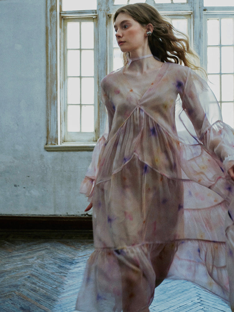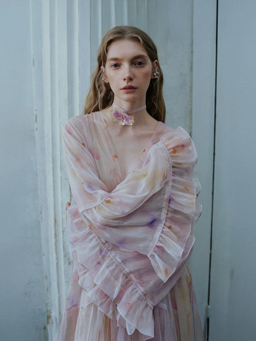 ギャザーショルダーチョーカー風 シフォンワンピース