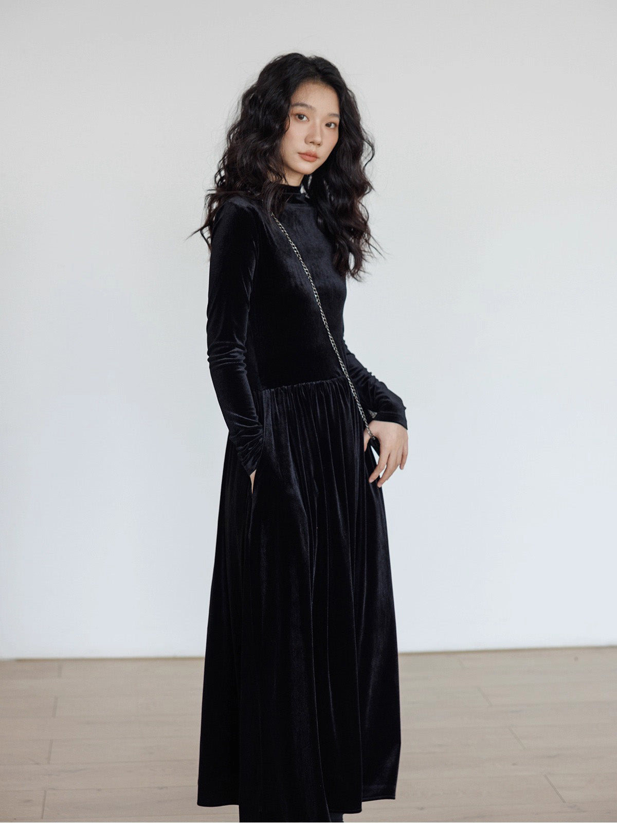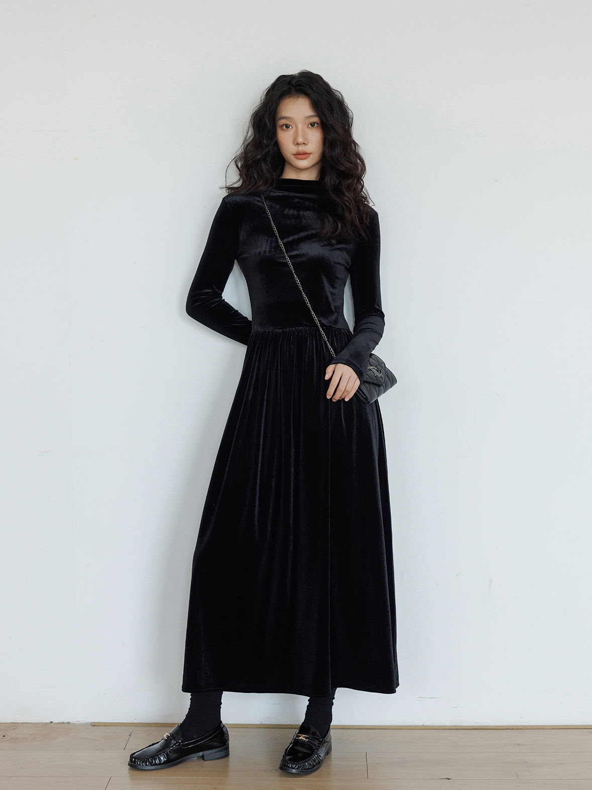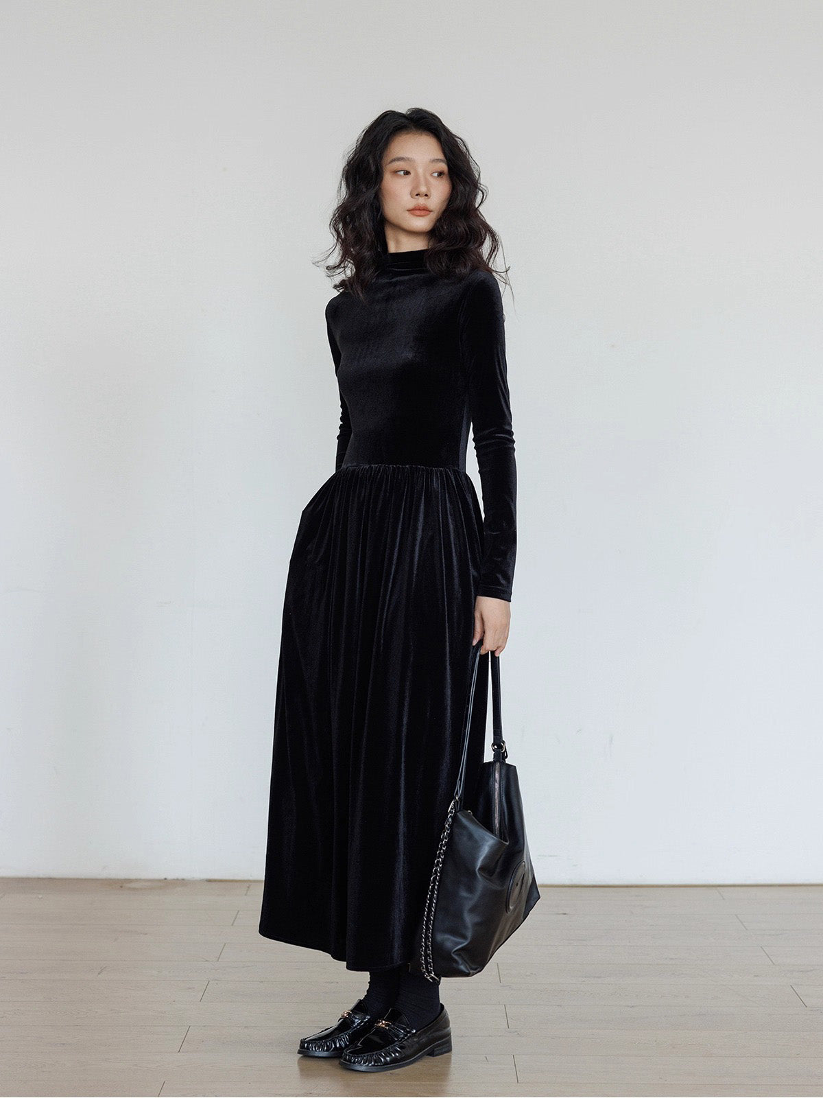 The fabric features a satin sheen and fine, random pleats throughout. It's a mini dress.