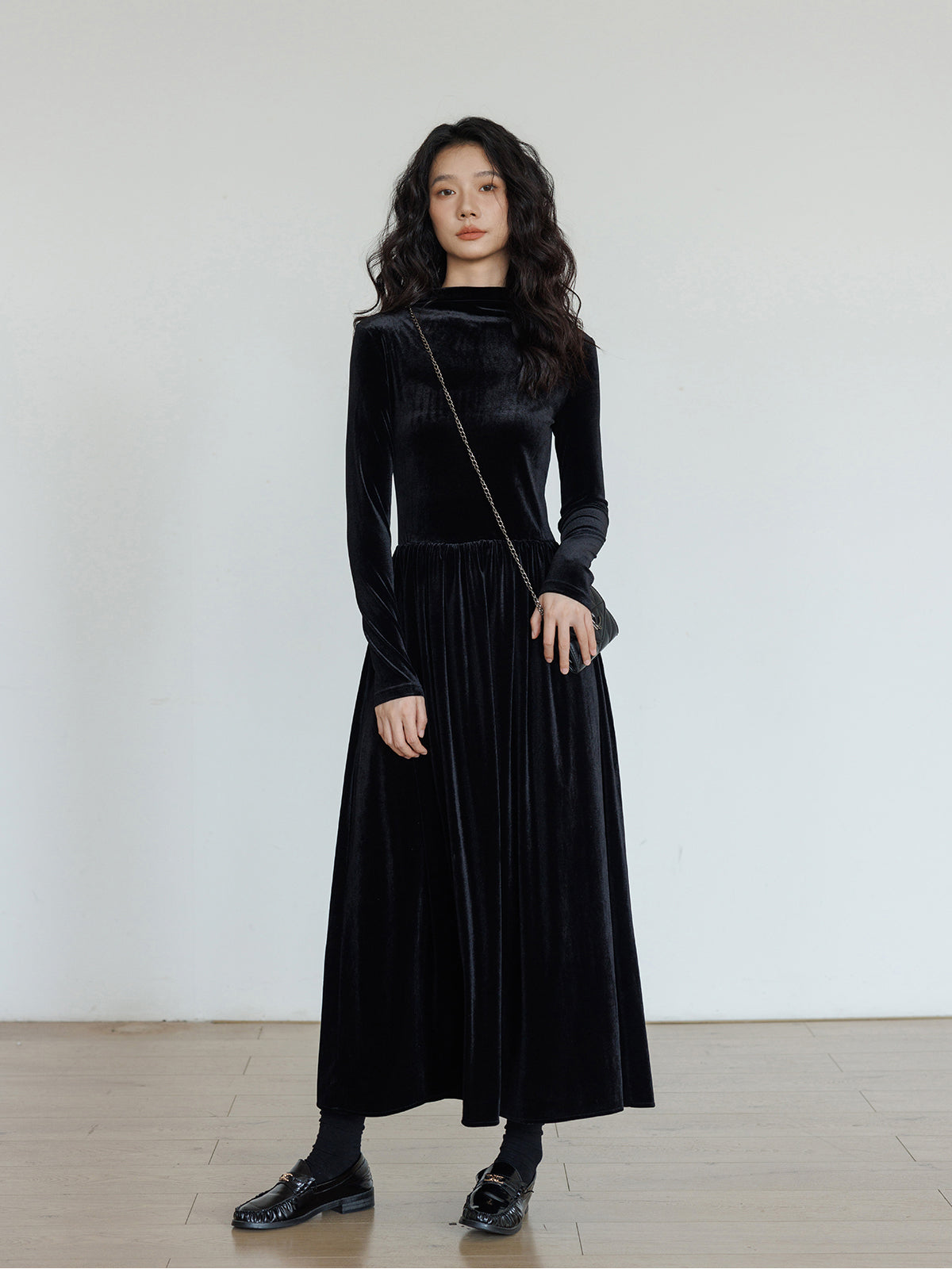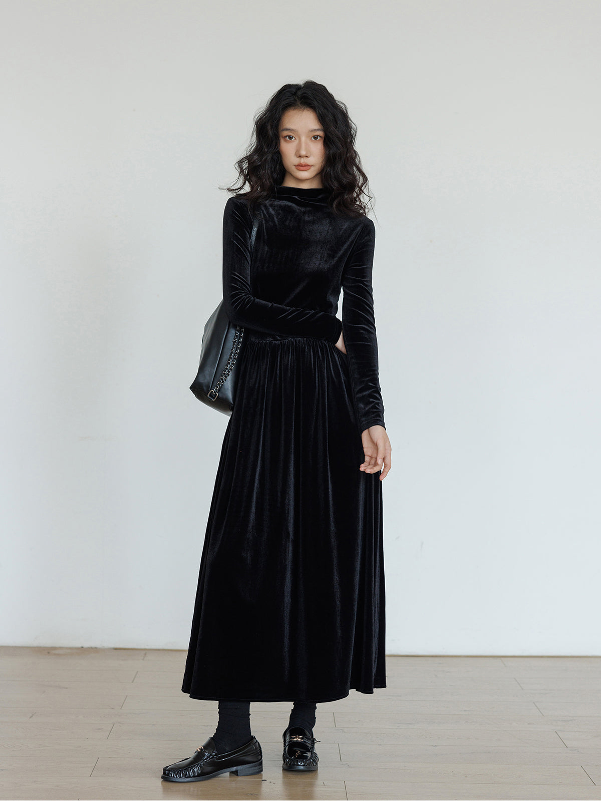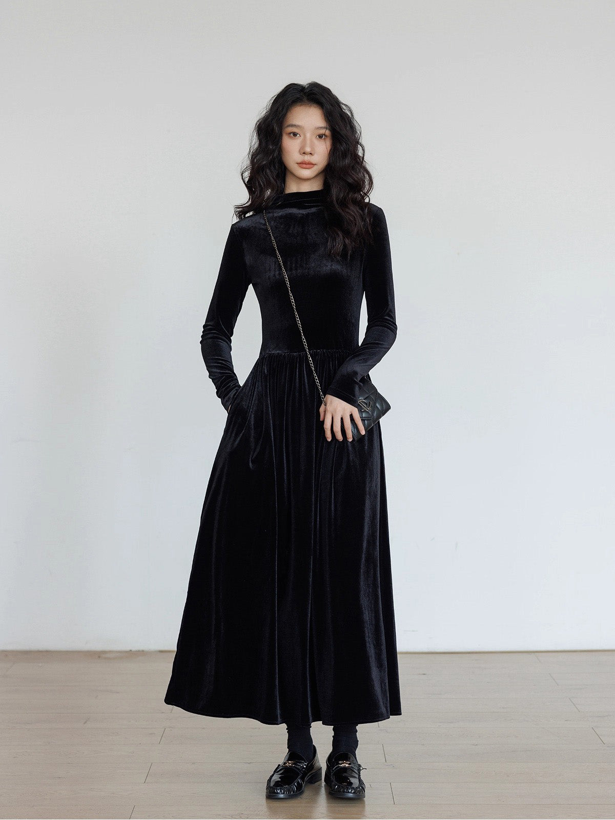 The fabric features a satin sheen and fine, random pleats throughout. It's a mini dress.